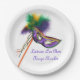 Ensemble de huit plaques en papier de 9 pouces avec une image d'un beau masque satin violet, vert et or sur un bâton avec des plumes et des rubans coordonnés, et les mots "Laissez Les Bon Temps Rouler" (Let the Good Times Roll) en écriture violette française. Voir la bocal à bonbons, tasse à expresso, flacon, tasse, pichet, verre à balles, théière et dessous de verre. Voir toute la collection Mardi Gras Plate dans le FOOD/BEV | Section Plats.
