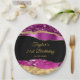 Cette plaque de fête d'anniversaire élégante et séduisante présente des larmes de glamour violet et or faux parties scintillant sur un arrière - plan noir. Le texte combine écriture manuscrite et polices sans serif modernes pour un look élégant et sophistiqué.