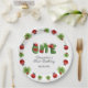 La plaque de papier d'anniversaire de la petite fille mignonne comporte une élégante lettre alphabet de coccinelle et entourée de coccinelle et cadre feuille vert. Objets correspondants dans notre boutique pour un thème de fête complet.