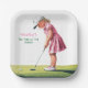 Illustration charmante d'une jeune fille habillée en robe rose et en casquette blanc, qui s'installe sur un parcours de golf magnifiquement entretenu sous un ciel bleu vif. Avec des montagnes dans l'arrière - plan et une ambiance festive, cette image capture la joie et la focalisation d'un enfant jouissant d'une célébration d'anniversaire unique sur le thème du golf. Parfait pour les invitations à des fêtes, la décoration à thème, ou des impressions de conservation pour une petite journée sportive spéciale.