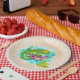 Plaques en papier avec une jolie illustration d'un lézard tropical vert entouré de feuilles et de fleurs d'une couleur bleu turquoise.
