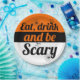 Mangez, buvez et soyez effrayant typographie audacieuse Plaque de papier de fête d'Halloween. Un design moderne d'halloween montrant le texte "Mange, bois et sois effrayant" une sorcière d'halloween, chauves-souris et araignées sur bandes orange, noir et blanc.