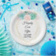 Assiettes en papier pour mariage avec un bouquet de succulentes aquarelles. Ces fleurs succulentes, feuilles et brindilles sont d'une couleur rose pastel et vert menthe douce. Un cadre géométrique tendance avec une bordure en faux or en feuille entoure votre texte.