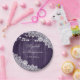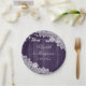 Elégante et romantique, rustique violet plaque de papier de mariage inspiré du bois de grange, dentelle blanche fleurie et lampes à cordes.