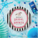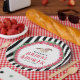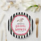 Cette assiette de fête Derby comporte un cheval de course à l'aquarelle avec un jockey en rose entouré d'une couronne de roses rouges avec la mention "Shower de Fiançailles". Il y a un fond rayé noir et blanc. Vous pouvez personnaliser avec un nom et une date.
