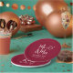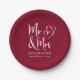 Plaques de papier rouge bordeaux personnalisées pour votre réception de mariage et événements mariages avec "Mr & Mrs" écrit dans un grand script blanc et une illustration blanche de deux anneaux mariages réunis. Ajoutez votre nom de famille et votre date de mariage.