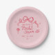 Ajoutez une touche de fantaisie à votre fête de mariage avec des assiettes en papier personnalisées ! Ces assiettes présentent un design rétro en rose et rouge, avec des illustrations dessinées à la main de rubans, talons hauts, fleurs et cœurs. Personnalisez le modèle avec le nom de la future mariée et la date de l'événement pour rendre votre célébration unique et spéciale !