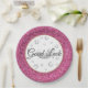 Plaque de papier de fête montrée avec des petits fers à cheval amusants, des symboles de chance entourent une image d'une couronne, la bordure extérieure faux parties scintillant en rose, la jante intérieure dorée sur arrière - plan blanc. Texte en noir : "Bonne chance". Montré en 9 po de taille. Vendu en paquet de huit. Customisez cet objet ou achetez tel quel.
