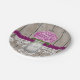 Plutôt rustique modèle monogrammed plaque en papier de mât de mason avec une fleur d'hydrangée violette rougeâtre et une clôture en bois et ancien motif damassé dentelle arrière - plan et ruban cousu de prune. Cette mariage ou nuptiale douche ou couple, fiançailles ou assiette de fête d'anniversaire personnalisée avec les initiales et monogramme du couple heureux ou marié et marié sur la jarre de maçon est parfait pour une campagne, ferme, fête de jardin ou de style baryade occasion spéciale ou célébration. Conçu par Chrissy H. Studios, LLC. Tous droits réservés.