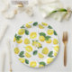 Plaques en papier avec un mignon motif de citrons jaunes avec des feuilles verts et des tranches de citron fraîchement coupées.