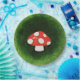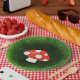 A cute illustration of a spotted red mushroom. Background is a green weathered texture, the color reminiscent of a lush green forest where you might find these adorable little fungi. The toadstool mushroom is a magical mystical symbole which can help add whimsy and mystery to your home and your life.
