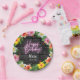 Ce design accrocheur présente une typographie rose néon "Joyeux anniversaire" entourée de la verdure verdoyante de palmiers tropicaux aqua, combinée à l'hibiscus rose et jaune vif avec des fleurs de plumeria blanches sur un arrière - plan mural en brique. Vous pouvez customiser le texte en fonction de vos besoins,