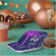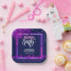 Plaque en papier d'anniversaire violet et marine avec cadre en néon, palmiers et lampes à cordes.