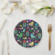 Diseño de plato de papel único con fondo azul oscuro, presenta un estilo folk con elementos como pájaros, flores y hojas con una paleta de colores vivos y alegres, que destacan sobre sobre la superficie.