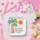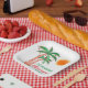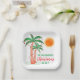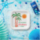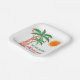 Fêtons Noël en juillet avec une fête ! Famille Invitation et amis à votre fête de Noël et décorez-la avec ces assiettes en papier carré de style insulaire ornées de palmiers dessinés à la main et décorés de lumières. Facilement personnalisable avec votre nom. Aquarelle originale © Michele Davies.
