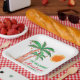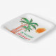Fêtons Noël en juillet avec un barbecue ou une fête ! Famille Invitation et amis à votre fête de Noël et décorez-la avec ces assiettes en papier carré de style île avec des palmiers dessinés à la main et décorés de lumières. Facilement personnalisable avec votre nom. Parce que nous créons notre propre oeuvre, vous ne trouverez pas cette image exacte d'autres designers. Aquarelle originale © Michele Davies.
