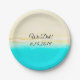 Bord de l'océan, eau sarcelle, plage de sable, assiettes en papier parfaites pour un mariage sur le thème de la plage ou une baby shower. Le texte dit "Nous avons fait" et vous pouvez modifier la date.