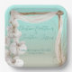 Cette assiette de mariage a un thème de plage romantique. L'arrière - plan bénéficie d'un dégradé qui ressemble à une plage ou une île tropicale de l'océan. Au centre se trouve une arche boho en bois et en mousselon. Une grande tige d'orchidées blanches de style aquarelle est placée sur la gauche.