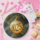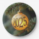 Un ornement doré avec "2025" est suspendu à une branche de pin vert, rayonnant une lumière chaude.