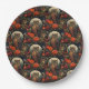 Paper plates with a cool looking owl with a piercing stare. A full moon in the back with a garden of red flowers.