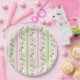 These paper plates have a preppy grandmillennial design featuring a pink Palm Beach style pool chairs and umbrellas surrounded by palm trees.