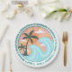 Plaques de papier simples à l'aspect de plage avec amusant rétro coloré Illustration de palmiers verts, vagues bleues, soleil orange, et rayons de soleil jaunes et roses. Entouré de mots liés à l'été... Vagues, Beach Parties, Good Vibes, Cocktails, Été, Amis, Rire, Soleil et Surf. Plats vraiment cool pour l'utilisation pendant la plage du barbecue des jardins et pour avoir en stock à votre patio ou bar tiki au bord de la piscine.