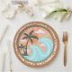 Plaques en papier texturé simple liège classique avec amusant rétro coloré Image d'illustration de palmiers verts, vagues bleues, soleil orange, et rayons de soleil jaunes et roses. Entouré de mots liés à l'été... Vagues, Beach Parties, Good Vibes, Cocktails, Été, Amis, Rire, Soleil et Surf. Plats vraiment cool pour l'utilisation pendant la plage du barbecue des jardins et pour avoir en stock à votre patio ou bar tiki au bord de la piscine.