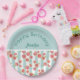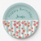 Joyeuses plaques de papier Anniversaire avec un motif numérique extensible de pamplemousse rose créé avec des aquarelles, sur un motif rayé vert pastel et blanc. La partie supérieure de l'article a un arrière - plan vert pastel.