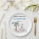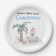 Ces assiettes de fête d'anniversaire personnalisées ont un thème de pirate mignon. L'image d'un bateau de pirates se trouve au fond, à proximité d'une île avec un coffre au trésor et de l'or. Un petit mouette est photographié debout sur l'île, et un message dans une bouteille est vu flottant dans la mer. Un message "Joyeux anniversaire" est imprimé en haut, suivi d'un exemple de nom que vous pouvez personnaliser pour inclure votre propre nom personnalisé ou autre texte.