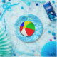 Conception de la fête d'été avec un ballon de plage dans une piscine cool. Ajoutez du texte pour personnaliser.