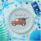 Plaques en papier avec l'image d'un petit camion de jouets mignon avec joyeux Noël peint à la main sur le côté. Portant un sapin de Noël décoré à l'arrière. Texte : Peace Love & Joy. Placez-vous sur un motif de flocon bleu et blanc.