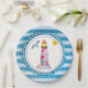 Plaques en papier à thème nautique. Conçu avec un motif rayé bleu et un cercle nautique bleu superposé. Un phare rayé rouge et une boule de plage, avec un soleil souriant et une mouette volante au loin positionné à l'intérieur du cadre.