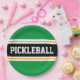 Cette conception sportive présente du texte PICKLEBALL en gras à l'intérieur d'une large bande horizontale de course centrale en noir surligné de deux rayures blanches flottantes contre des rayures extérieures vertes. Le texte peut être personnalisé.