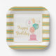 Cette plaque en papier de fête d'anniversaire présente un design moderne pour les filles avec des ballons en parties scintillant d'or et un gâteau d'anniversaire rose. Personnalisez cette plaque en papier avec l'âge de votre enfant et l'accueil de fête.