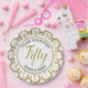 Célébrez le couple heureux avec cette élégante plaque de papier 50e anniversaire or et blanc, texte et police sont facilement personnalisables sur commande