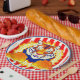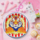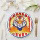 Cette assiette en papier fête est parfaite pour un pique-nique d'été 4 juillet ! Un tigre audacieux saute à travers un anneau de feu ! Arrière - plan avec Big Top rayures rouges et blanches *Visitez Fun4UDesigns Collections pour assortir les produits Circus Tiger!