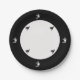 Une large jante noire entoure le cercle blanc central de l'assiette. À l'extrémité extérieure du cercle se trouvent quatre chats noirs. Il y a quatre sorcières blanches qui volent autour de l'anneau extérieur.