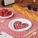 Coeur rouge scandinave simplement renversant avec le texte de juillet de Dieu. Serviettes de papier et plus disponible coordonnés.