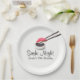 Plaques De Nuit Sushi. Ces assiettes sont conçues avec un arrière - plan blanc et un morceau de sushi tenu par des baguettes et trempant dans une tasse de sauce soja. Ce design minimaliste peut être utilisé pour les anniversaires, les proms, les douches nuptiales, les soirées de ménage ou toute autre fête que vous voudriez. D'autres articles de fête sont disponibles à la boutique Metro-Events Zazzle et à Metro-Event.com.