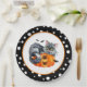 La plaque de papier de fête d'Halloween est présentée dans un design pois noir et blanc avec un chat sur un imprimé citrouille. Customisez cet objet ou achetez tel quel. Montré en 9 po de taille. Vendu en paquet de huit. Image stock freepik.com