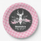 Plaques de papier bois rose pour baby showers filles. En vichy rose, tableau noir et chevreuils.