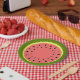 Conception avec une touche rétro inspirée d'une pastèque avec un cercle rose et motif de graines sur un arrière - plan vert foncé. Un design personnalisable pour personnaliser avec votre propre texte, images et idées. Image d'art numérique originale créée par QuirkyChic.