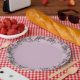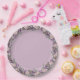 Ces plaques en papier ont une bordure en germe rose et violet le long du bord sur un arrière - plan lavande. Coordonnées avec la collection de la Croix de Pâques.
