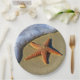 Photographie de plage frappante, une étoile de mer orange vif au bord de l'eau sur le point d'être recouverte d'une douce vague.