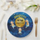 Premier voyage autour du soleil premier anniversaire fête personnalisée assiettes de fête modèle avec mignon ours en peluche drôle dans un casque d'espace volant dans l'espace sur le ciel céleste.