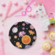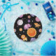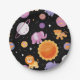 Une plaque circulaire au design dynamique et fantaisiste. L'arrière - plan est un noir profond, orné de divers éléments célestes comme des planètes, des étoiles et des comètes. Les planètes sont colorées, avec des teintes de violet, d'orange et de jaune. Il y a trois animaux représentés : un éléphant, un lion et un léopard. L'éléphant est rose et se tient près du centre, le lion est orange et est positionné vers le bas à droite, et le léopard est violet et est situé vers le haut à gauche. Le soleil, représenté comme un cercle orange vif, est situé au centre de l'assiette.