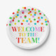 Bienvenue dans les assiettes en papier de l'équipe en motif de confetti arc-en-ciel.