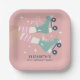 Plaques de papier d'anniversaire pour patinage rose vif avec une illustration rétro de patins à rouleaux bleus turquoises sur une fille portant des chaussettes à tube rayé rose et "Let's Roll" dans un script amusant style des années 70.