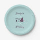 L'arrière - plan bleu oeuf d'un robin décore cette plaque de papier minimaliste de fête d'anniversaire. Le texte est violet profond. Bien que la valeur par défaut indique "75e anniversaire", vous pouvez facilement modifier le texte pour le nom, le nombre d'années et l'événement. Très féminine et féminine ! La serviette papier correspondant est zazzle article 25649806576264392. Tous droits réservés © 2015 Alan & Marcia Socolik.