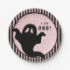 Cette assiette en papier Halloween Vintage effrayante présente un motif damassé rose victorien avec des rayures noires et roses autour du bord. Il y a une grande silhouette de fantôme avec un texte qui dit "Je fais Bouh."